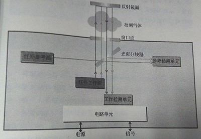 如上圖所示,這是一種采用了通過加熱反射鏡面來減少濕度對氣體傳感器檢測精度影響,雙光路的設計降低靈敏度變化的紅外傳感器。其所有檢測電路、光源和檢測器都被放置在真空密封的一個空間里面,避免了這個氣體檢測儀測量結(jié)果不會受到環(huán)境中灰塵和濕度的影響。所有參比光束和檢測光束都要通過一個窗口來進入開放式氣體檢測室,再通過鏡面反射進入窗口,完成兩次吸收后光束再回到密封光路中,最后再計算可燃氣體的濃度。需要 注意的是,這個設計中的窗口和反射鏡采用的加熱設計是為了防止檢測結(jié)果受到環(huán)境中的濕度影響。